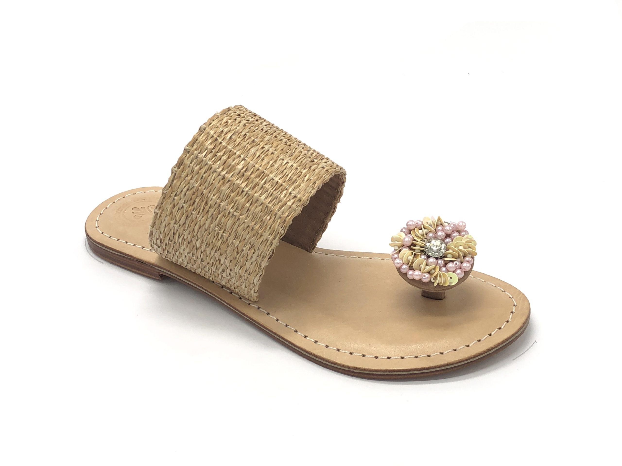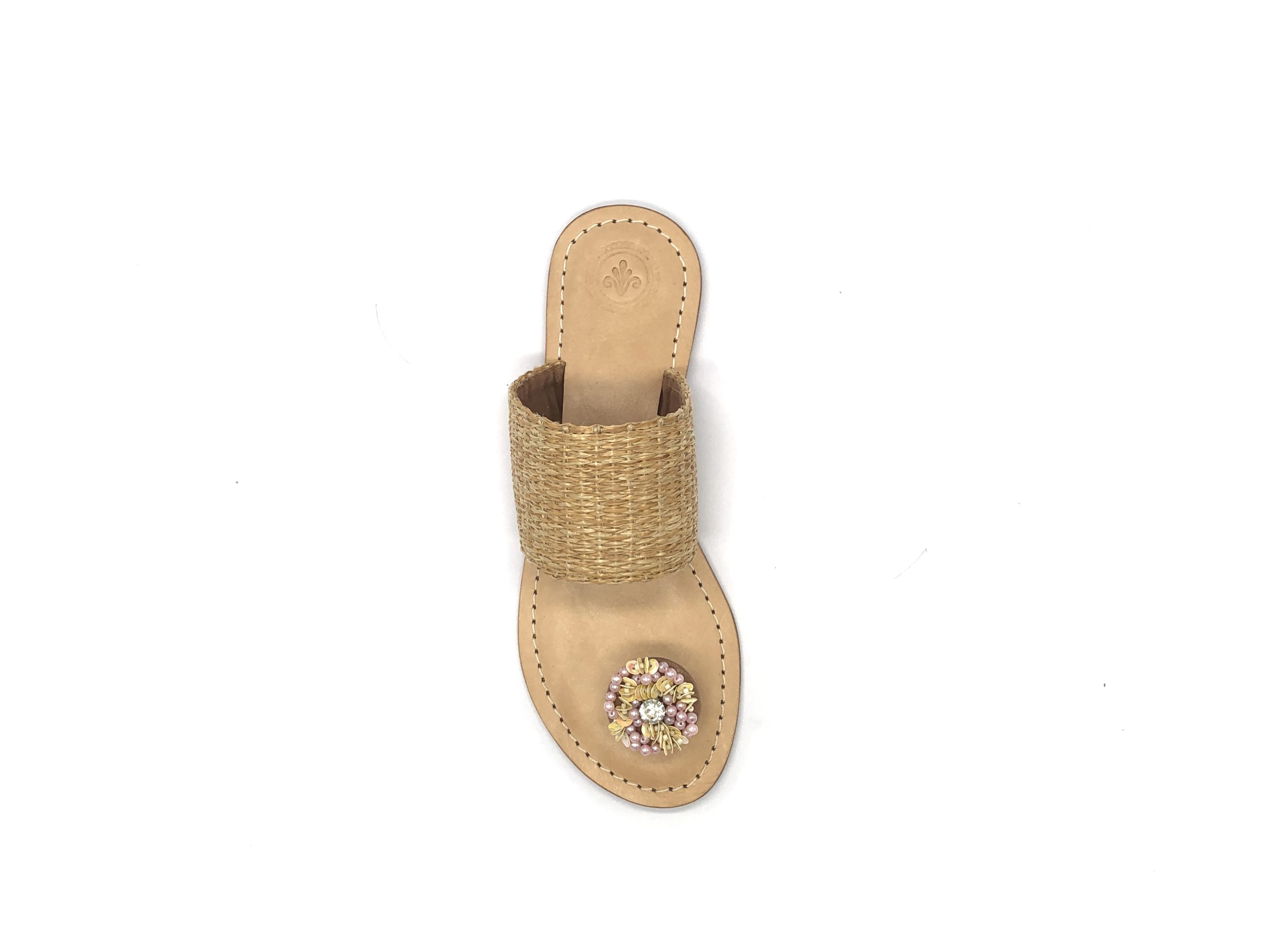Sandalo con tomaia in rattan, con applicazioni di accessori, sottopiede imbottito soffice in pelle e suola in vero cuoio, tacco 3 cm.