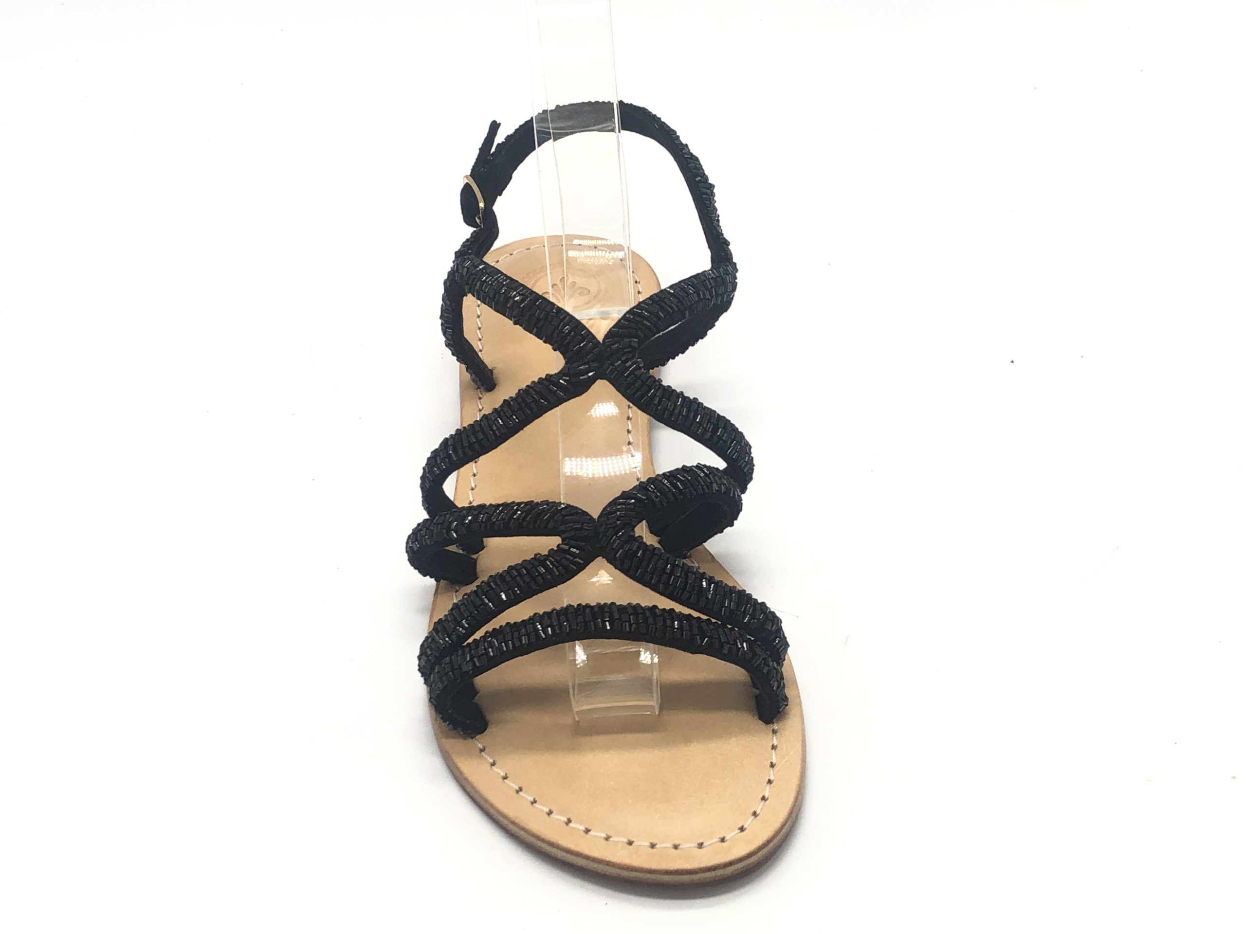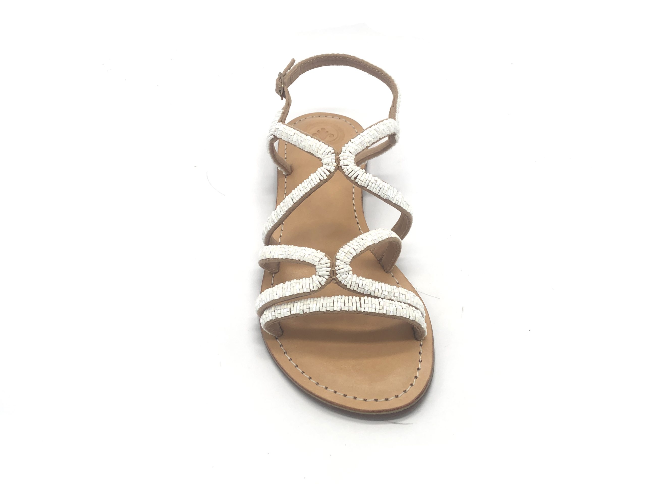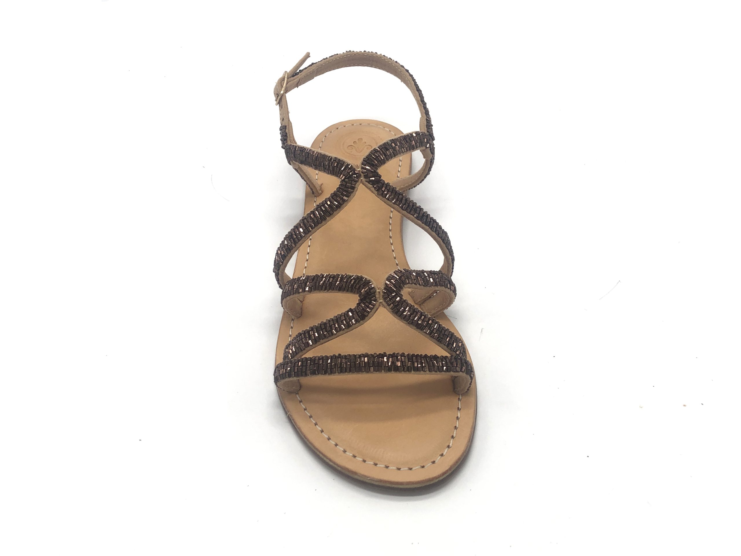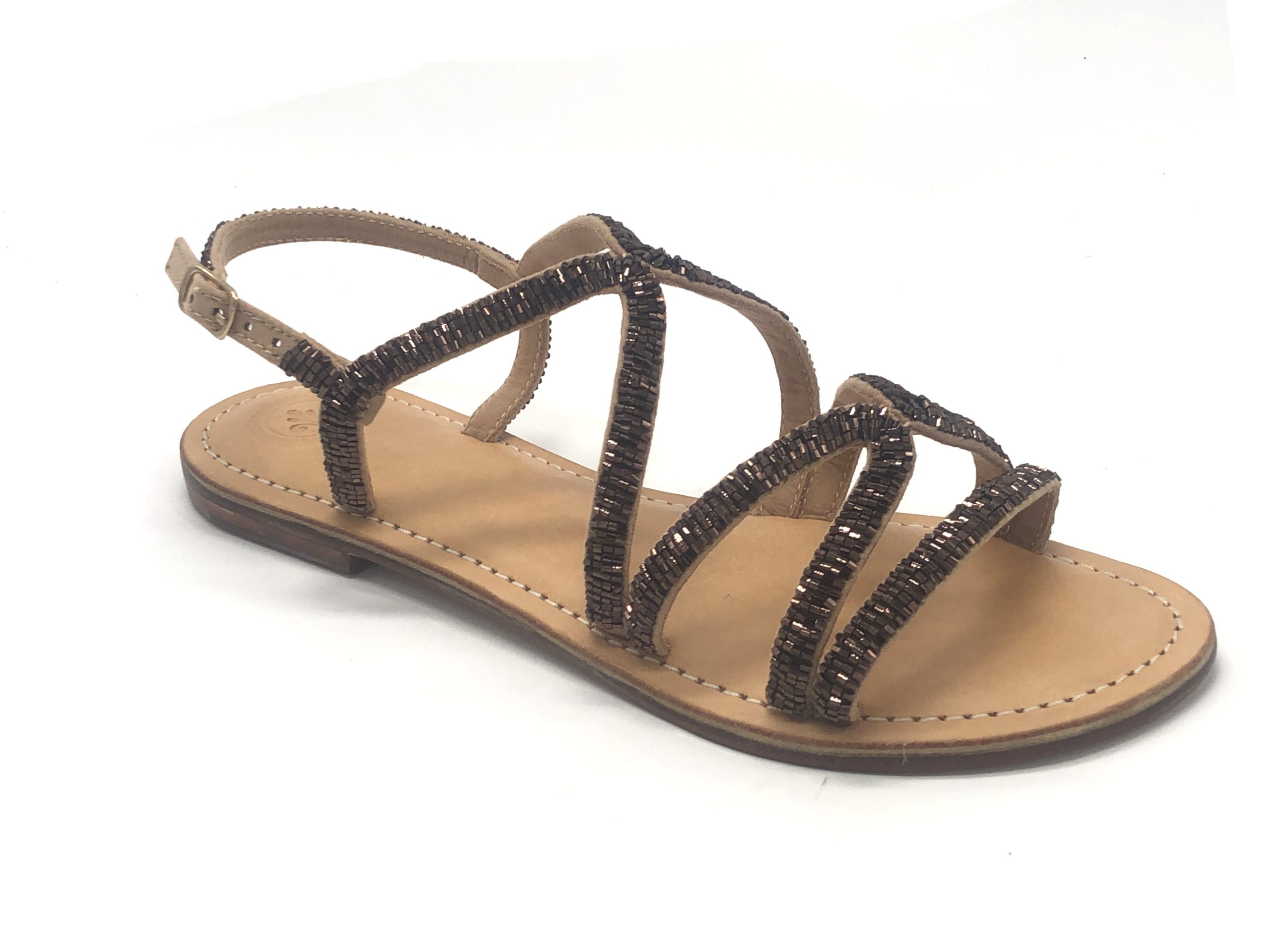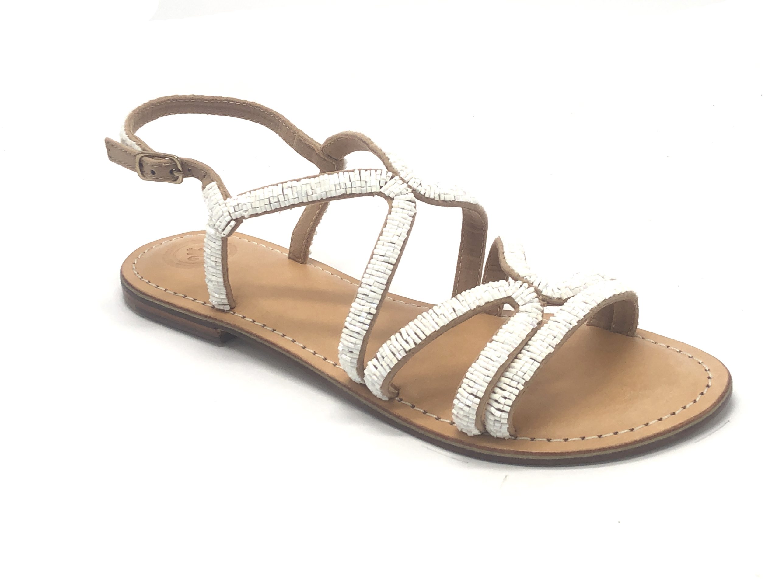 Sandalo con tomaia in cotone e perline ikat, con sottopiede imbottito soffice in pelle e suola in vero cuoio, tacco 1 cm.