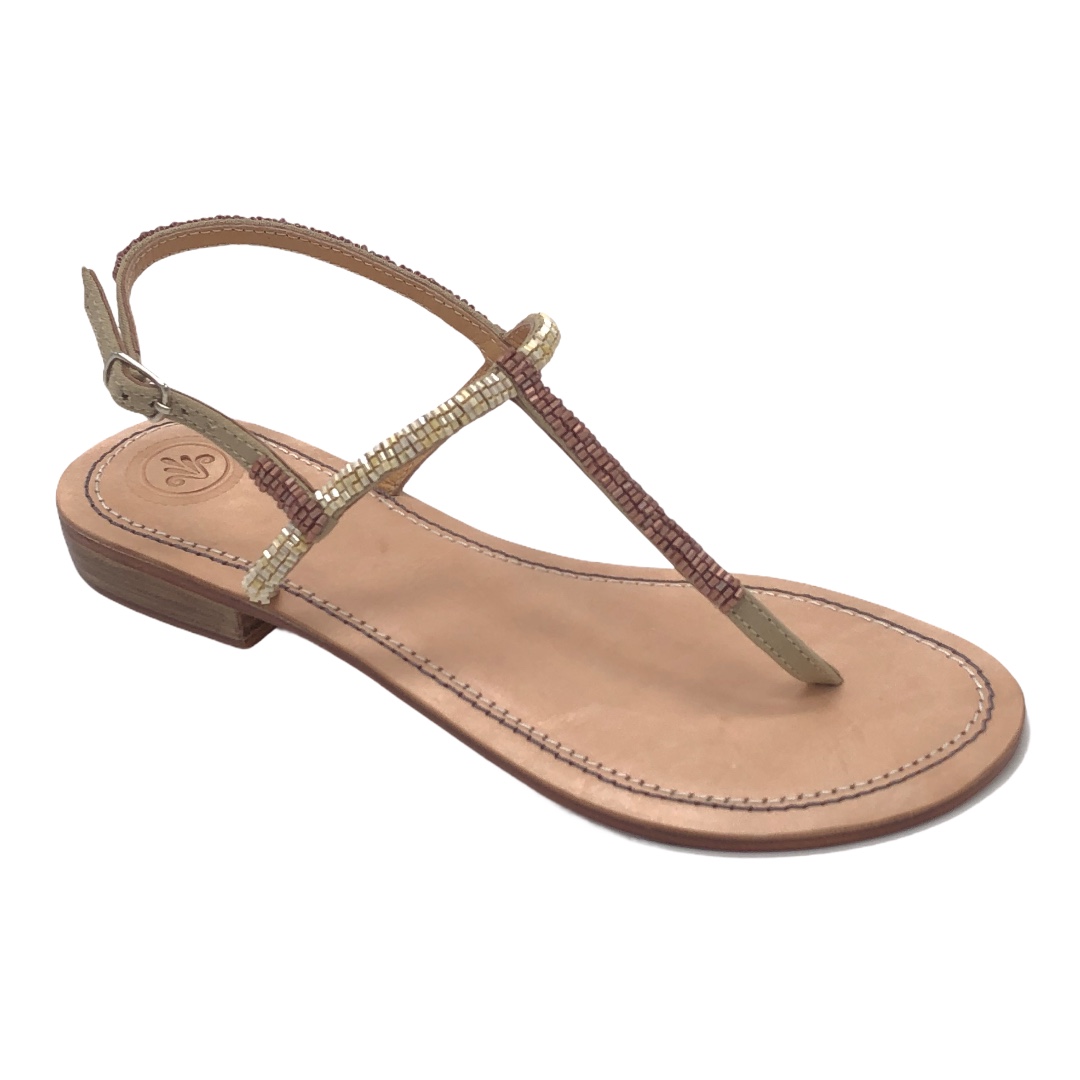 Sandalo con tomaia in cotone e perline ikat, con sottopiede imbottito soffice in pelle e suola in vero cuoio, tacco 1 cm.