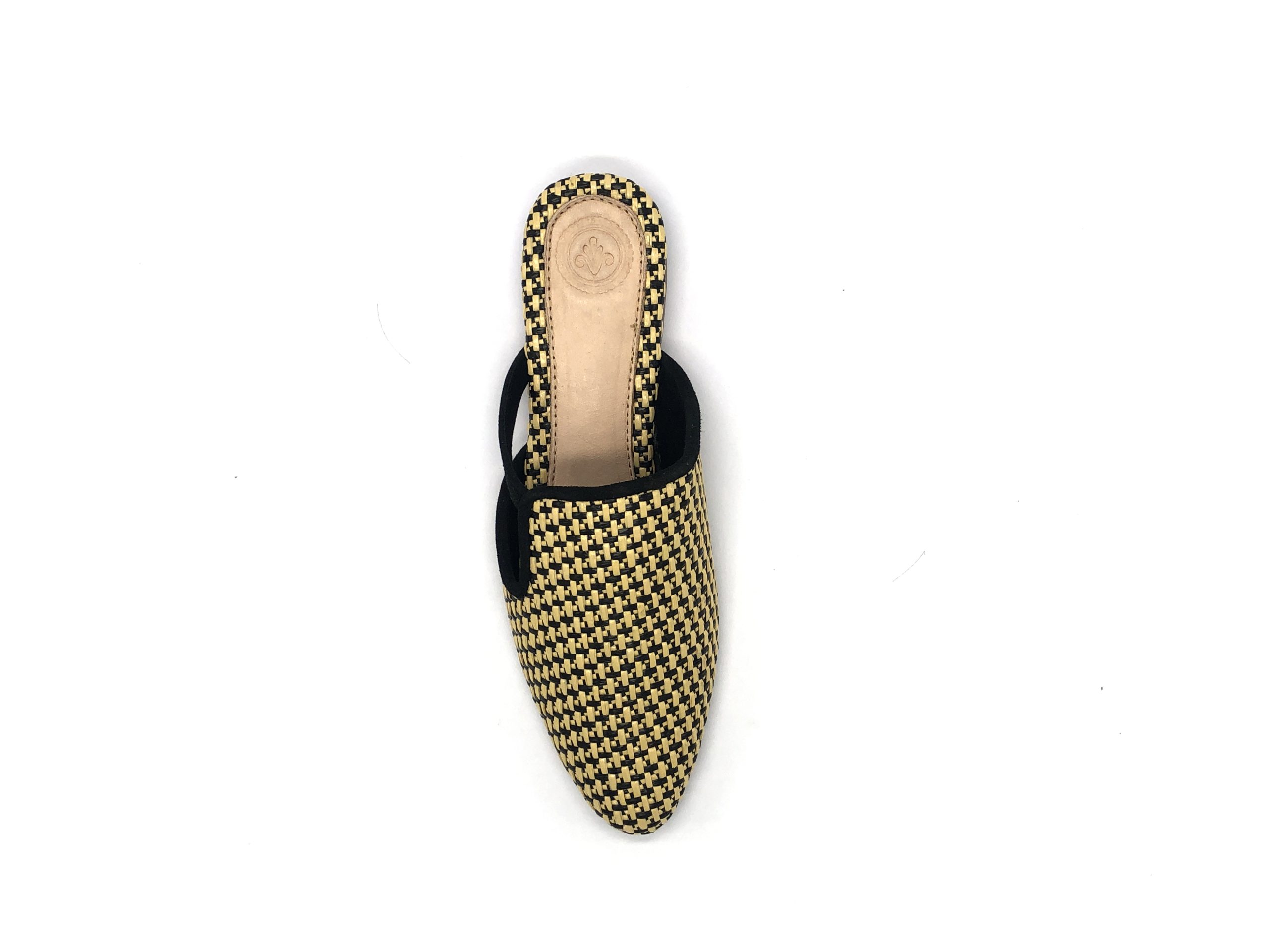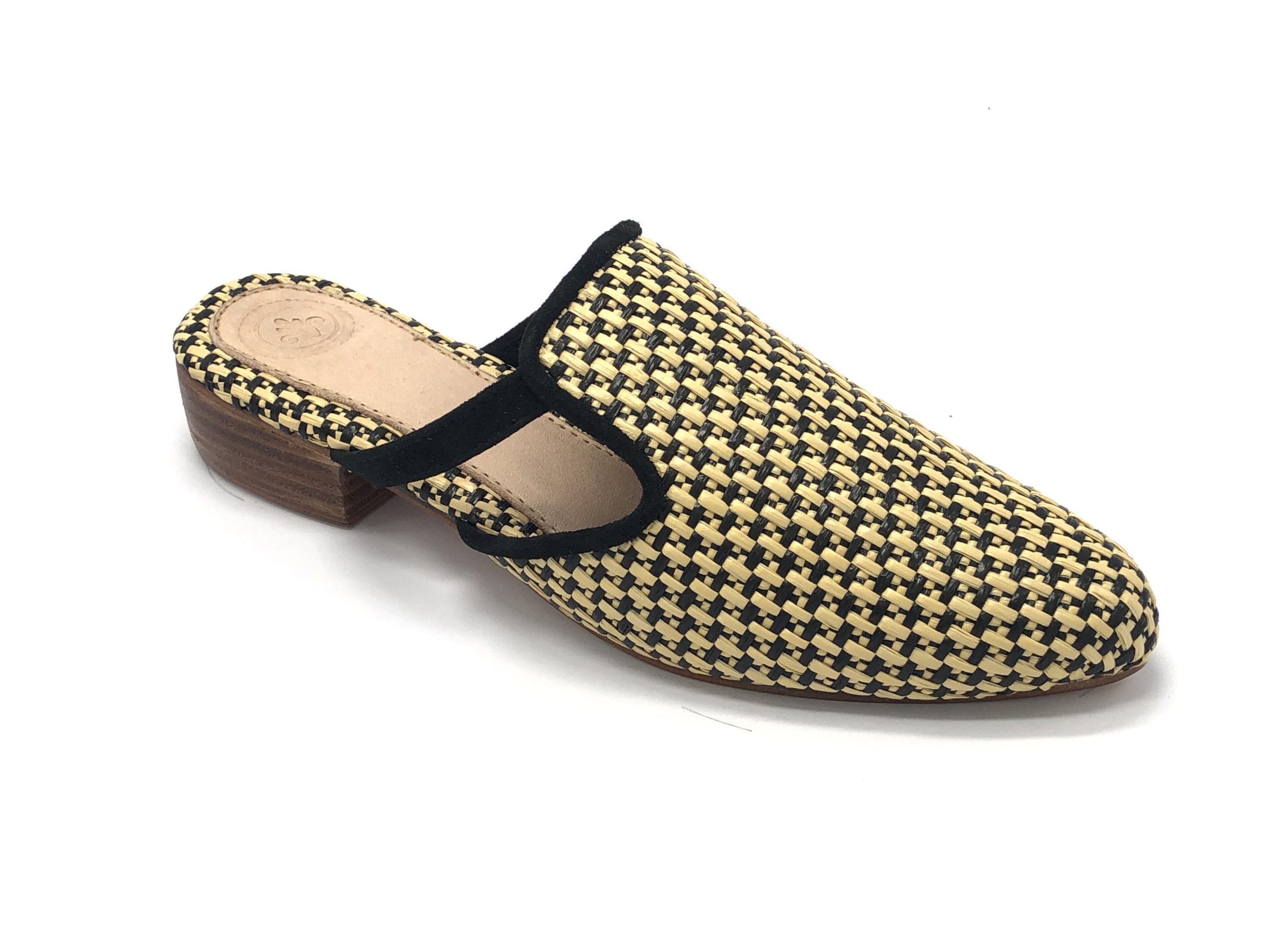 Sandalo a sabot con tomaia in rattan, sottopiede imbottito soffice in pelle e suola in vero cuoio, tacco 3 cm.